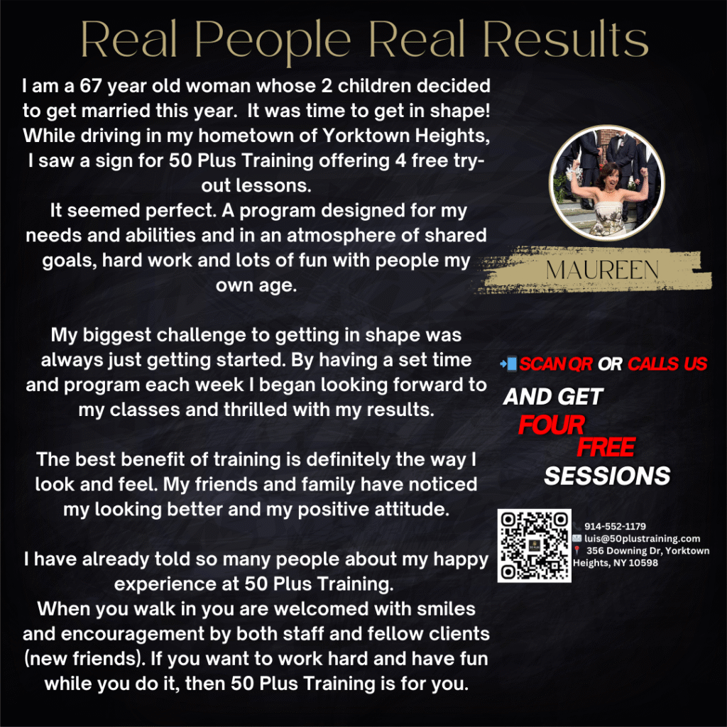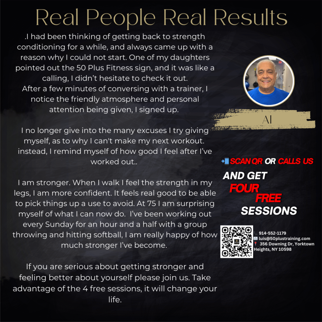 I can’t recommend 50PlusTraining enough! Luis is an amazing trainer who truly understands the unique needs of individuals over 50. I’ve been working with him for a few months, and I’ve already noticed significant improvements in my strength, mobility, and overall health. The personalized approach, focus on safety, and attention to detail have made all the difference. I love that I’m not only losing weight but also gaining strength and confidence in my body. If you’re looking for a fitness program that’s tailored, supportive, and effective, this is it! Highly recommended!